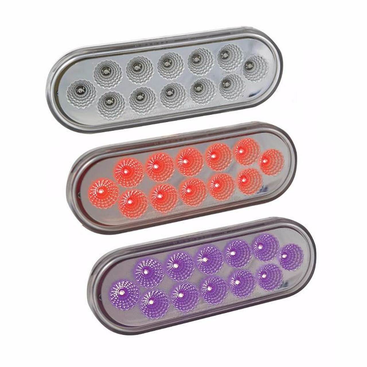 Oval Dual Revolution Red Stop / Turn / Tail Signal with Blue/Green/Purple Marker 12 LED Light. 6 1/2 Inch Length x 2 1/4 Inch Width x 1 Inch Height. Fits Standard Oval Grommet. Installs with Standard 3 Prong Pigtail and Extra Wire with Male Bullet Plug for Blue
